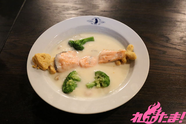 ガンギマスに見立てた魚に、イカやエビ、ブロッコリーをいれ、ほんのりカレー味のおさかなクッキーを添えました。クリーミーなシチューにシーフードとカレー味のクッキーがベストマッチ!