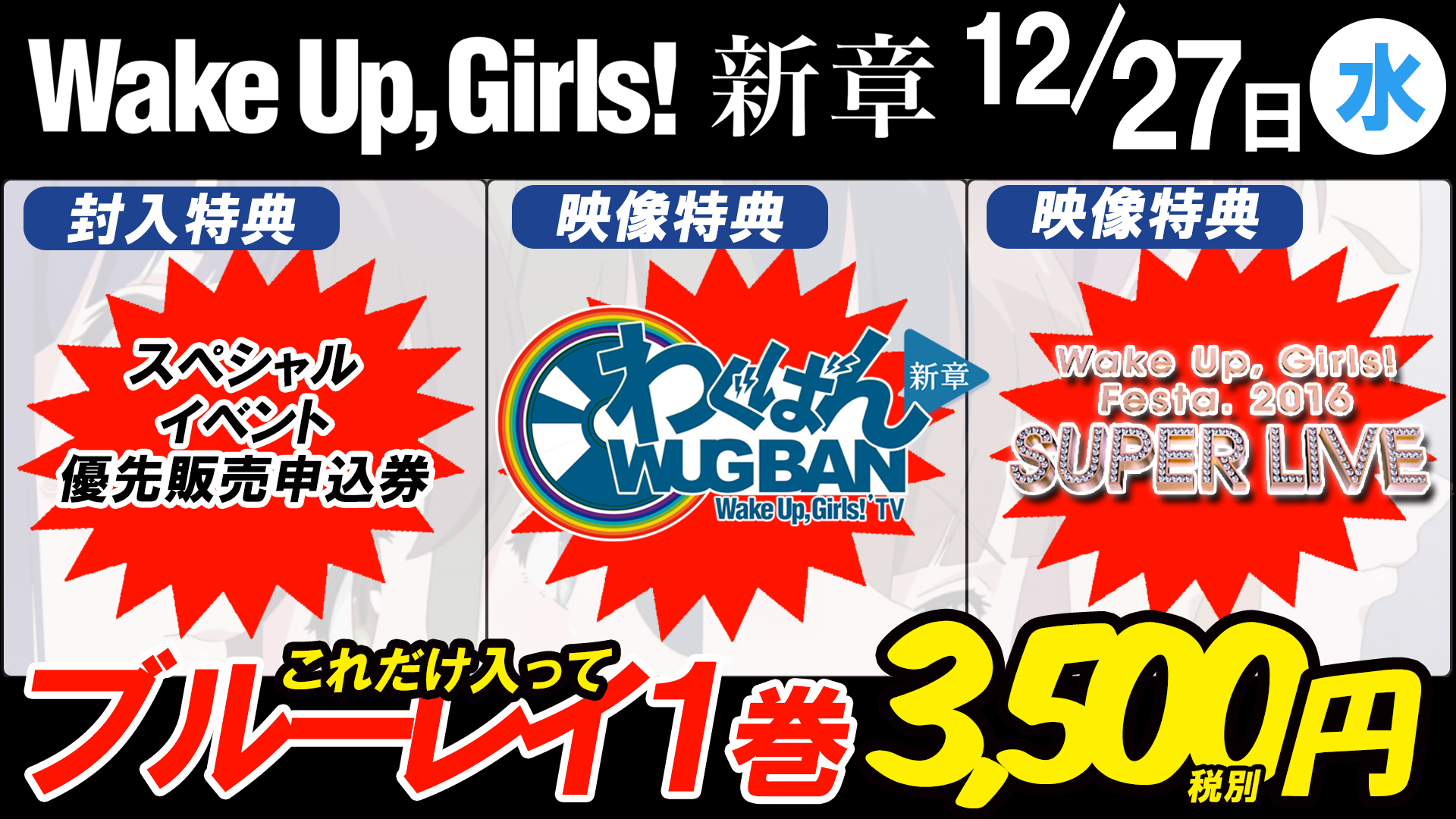 さらに、12月27日(水)には、Blu-ray第1巻も発売が決定!今回は過去テレビ東京にて放送されたバラエティ番組の特別版「わぐばん!新章」が映像特典で収録されるだけでなく、昨年幕張で開催された「Wake Up, Girls!FESTA.2016 SUPERLIVE」も収録。加えて、2018年5月12日に幕張メッセイベントホールにて開催が決定した、スペシャルイベントの、抽選優先販売申込券の封入が決定しました。出演は、Wake Up, Girls!(吉岡茉祐 永野愛理 田中美海 青山吉能 山下七海 奥野香耶 高木美佑)ほか を予定しております。