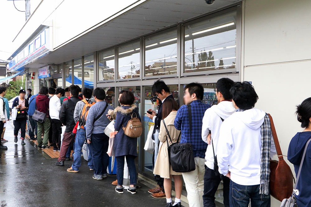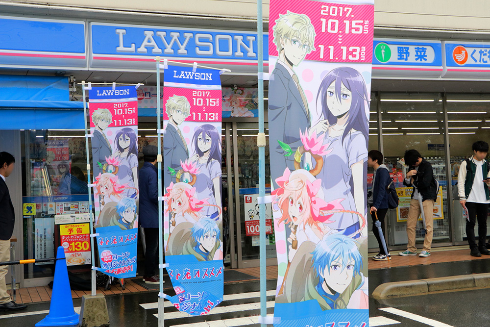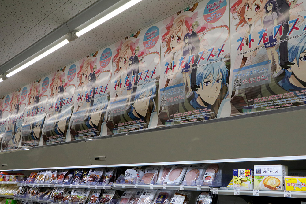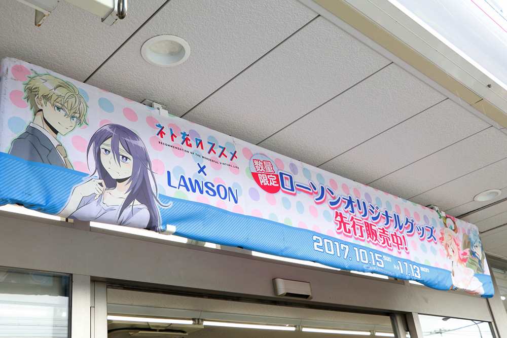 あいにくの雨が降る不安定な天候の中、グッズ販売前から長蛇の列ができ上がる人気ぶりは、本作の注目度の高さが伺えた。ファンの視線は、店内に所せましと貼られていたポスターや、駐車場に立てられたのぼりや看板など、想像以上に展開された「ネト充」装飾に集まる。