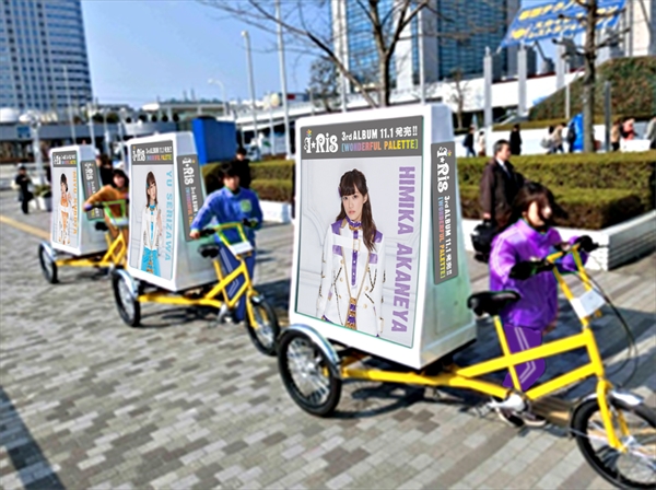今回のキャンペーンは、5周年と11月1日に発売する3rdアルバム「WONDERFUL PALETTE」の発売を記念して行われるもので、アルバムのジャケット写真と各メンバーのアーティスト写真の看板を搭載した自転車、“アドチャリ”は、i☆Risに準えて、6台(メンバーの数)連なって走行します。