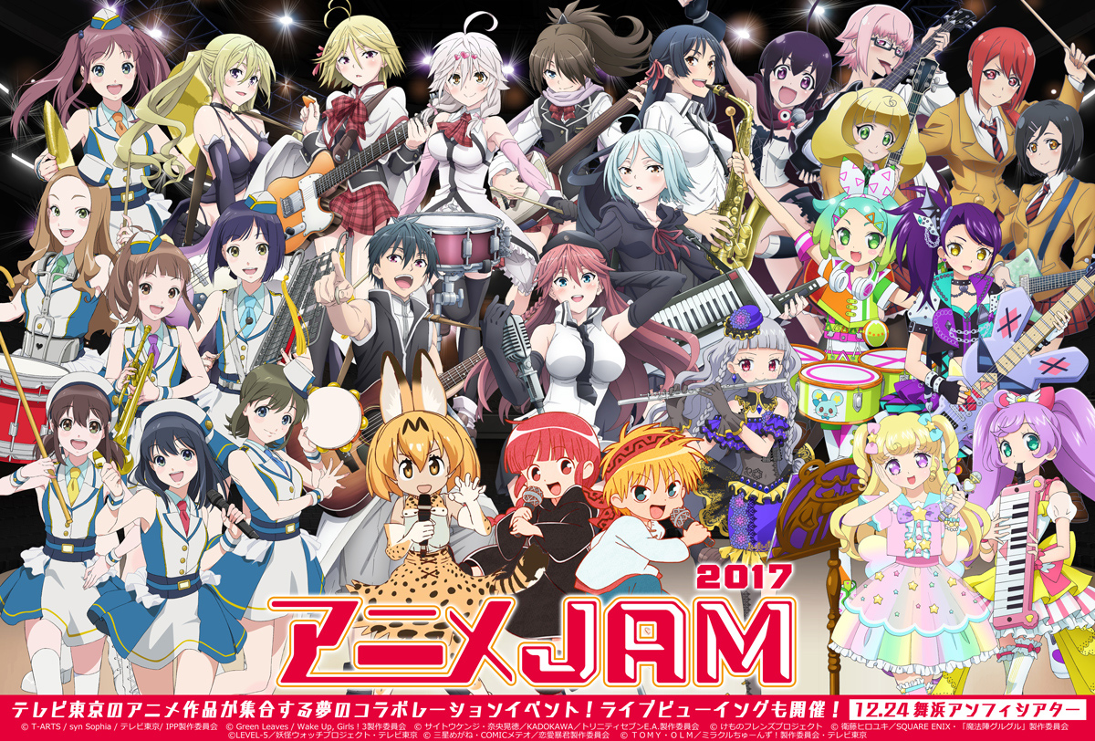 「アニメJAM」はテレビ東京で放送中・放送予定の人気アニメ作品の声優・アーティストが大集合するイベントです。2014年からスタートし、今年で4回目の開催を迎えます。2016年は「Rock Stage」と「Pop Stage」2つの異なるステージが行われ、約10,000人のファンを動員し、年末恒例のコラボレーションイベントとなっています。今年は開催日が12月24日(日)になり、現在6つのアニメ作品より多くの声優陣やアーティストが参加予定です。「けものフレンズ」・「恋愛暴君」・「魔法陣グルグル」は今年初参加作品。アーティストも「i☆Ris」や「Wake Up, Girls!」・「ZAQ」・「どうぶつビスケッツ×PPP」等が参加予定です。