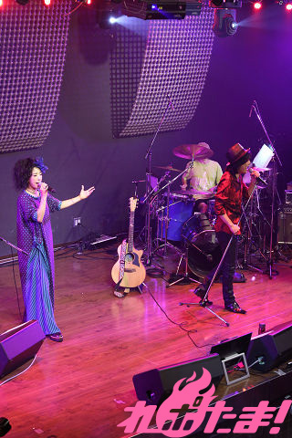 いとうさんが「「どん底ソング」と評する(笑)PCゲーム『School Days』EDテーマ「悲しみの向こうへ」を切なく歌い上げると、MCで呼び込んだのはこの日最初のゲスト、小野正利さん。小野さんは一足先にデビュー25周年を迎えた「先輩」。謙虚な立ち居振る舞いを見せつつ、制作中の洋楽カバーアルバムのエピソードを紹介。26年目に向けてまい進する小野さんとともに披露したのはPCゲーム『装甲悪鬼村正 -FullMetalDaemon MURAMASA-』OPテーマ「MURAMASA」、そして小野さんが『吸血殲鬼ヴェドゴニア』OPテーマ「White Night」でシャウトした。