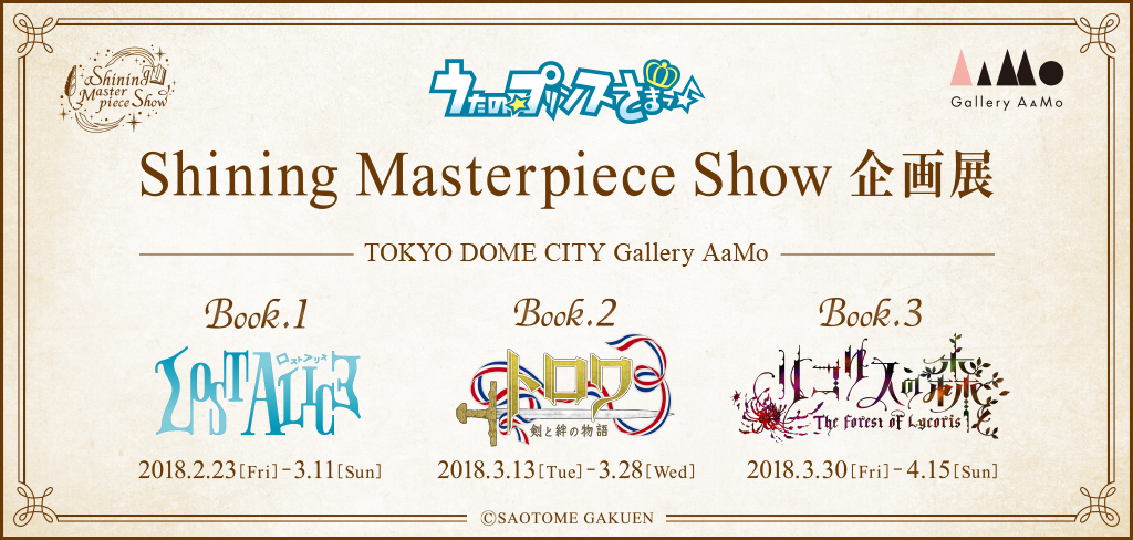 東京ドームシティ(文京区後楽 1-3-61)の「Gallery AaMo(ギャラリー アーモ)」にて、イベント『うたの☆プリンスさまっ♪Shining Masterpiece Show 企画展』を2018年2 月 23 日(金)~4 月 15 日(日)の期間限定で開催することが決定いたしました!