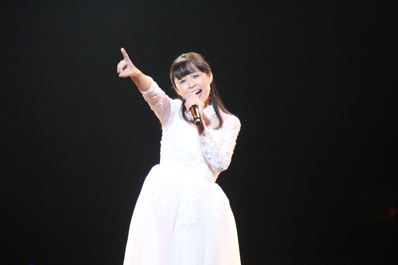 続く後半戦は、11月19日・軽井沢での自身初のアコースティックライブツアーの開催も決定している今井麻美による重厚な楽曲「Words of GRACE 〜冬のダリア〜」からスタート。TVアニメ『プラスティック・メモリーズ』EDテーマ「朝焼けのスターマイン」や「漆黒のサステイン」「Dear Darling」など人気曲を中心に全6曲を熱唱。
