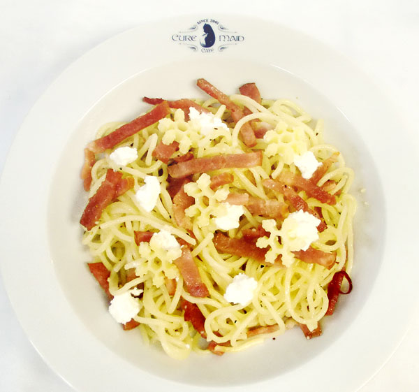 終わりを迎えた世界をイメージし、雪の結晶の形のショートパスタとカッテージチーズの白い雪をあしらったペペロンチーノ。ベーコンもたっぷりで満足な一品。