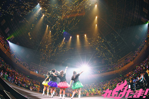 まずは「正解はひとつ!じゃない!!」「総天然色フルパワー」など、アニメの定番曲を続々と投下。何度聴いてもやっぱり盛り上がる楽曲群だ。会場となる両国国技館の中央に設けられたステージと向正面の正面ステージを行き来してのパフォーマンスも効果的だった。