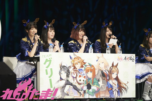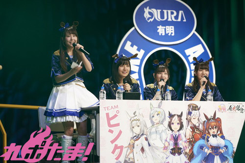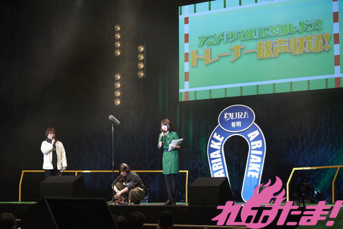 まずは競馬場のコースを模したステージ上で、全員でテーマソング「うまぴょい伝説」を熱唱した。新田さんと首藤さんは『ウマ娘』ライブ初参戦、さらに香坂さんは人生初ライブということで初々しいメンバーがそろった今回のイベント。「知力・体力・運を育てよ! G1有明記念」コーナーでは、ピンク(和氣あず未さん、鬼頭明里さん、上田瞳さん、木村千咲さん、高柳知葉さん)、ブルー(高野麻里佳さん、香坂さきさん、新田ひよりさん、松井恵理子さん、前田玲奈さん)、グリーン(Machicoさん、相坂優歌さん、大橋彩香さん、首藤志奈さん)の3チームに分かれてさまざまな企画にチャレンジ。トレーナー(ファン)は事前に勝利チームを予想し、見事的中したトレーナーにはうれしいお土産「的中記念ステッカー」が贈られた。
