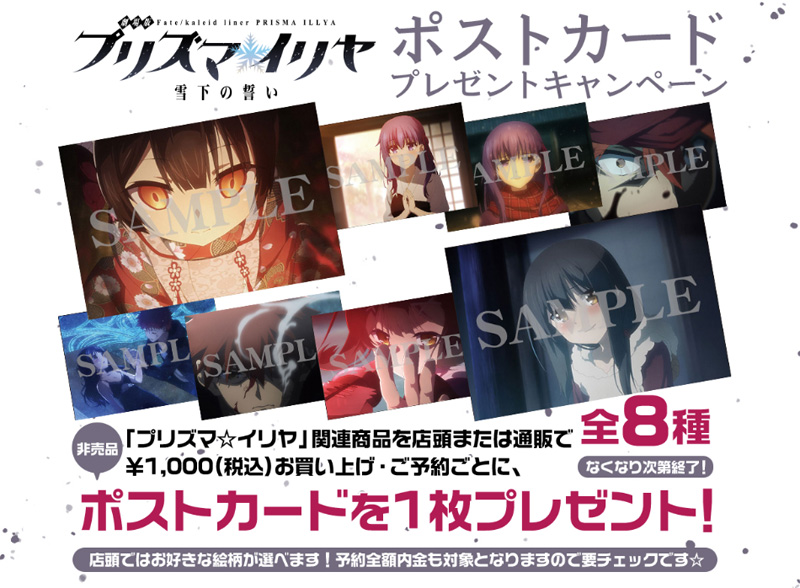 展覧会会場を含むキャンペーン開催店舗にて「Fate/kaleid liner プリズマ☆イリヤ」関連商品お買上げ\1,000(税込み)ごとに1枚【特製ポストカード(全8種)】をプレゼント。