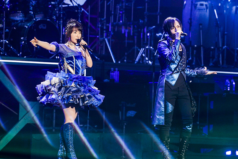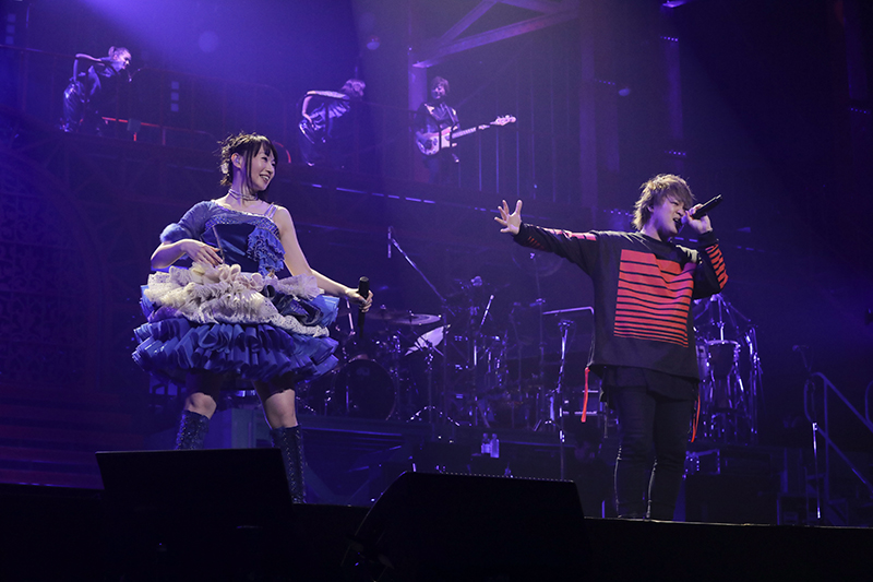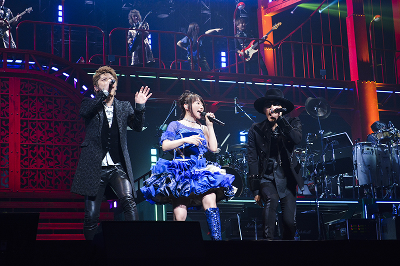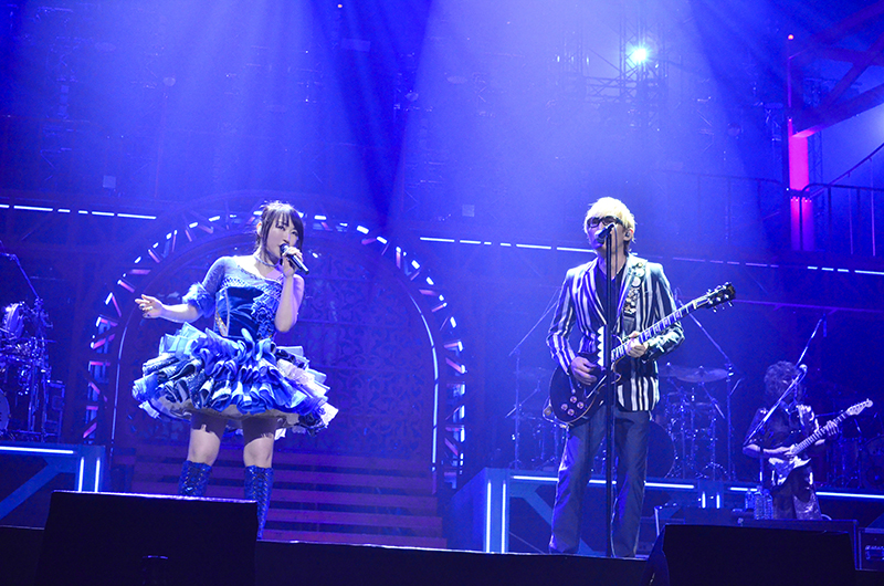 2017年にリリースされたシングル曲「Destiny’s Prelude」に続き、花びらが舞う中で情感たっぷりに歌い上げたバラード曲「粋恋」は、現在放送中のTVアニメ「バジリスク ~桜花忍法帖~」のエンディングテーマ。悲しくも純粋で一途な恋を描いた楽曲の世界観に一気に引き込まれた。水樹がステージから去った後も、アウトロでギターの美しい音色が響き渡り、曲の余韻に浸っていると、会場の明かりが消え、幕間映像のコーナーへ。