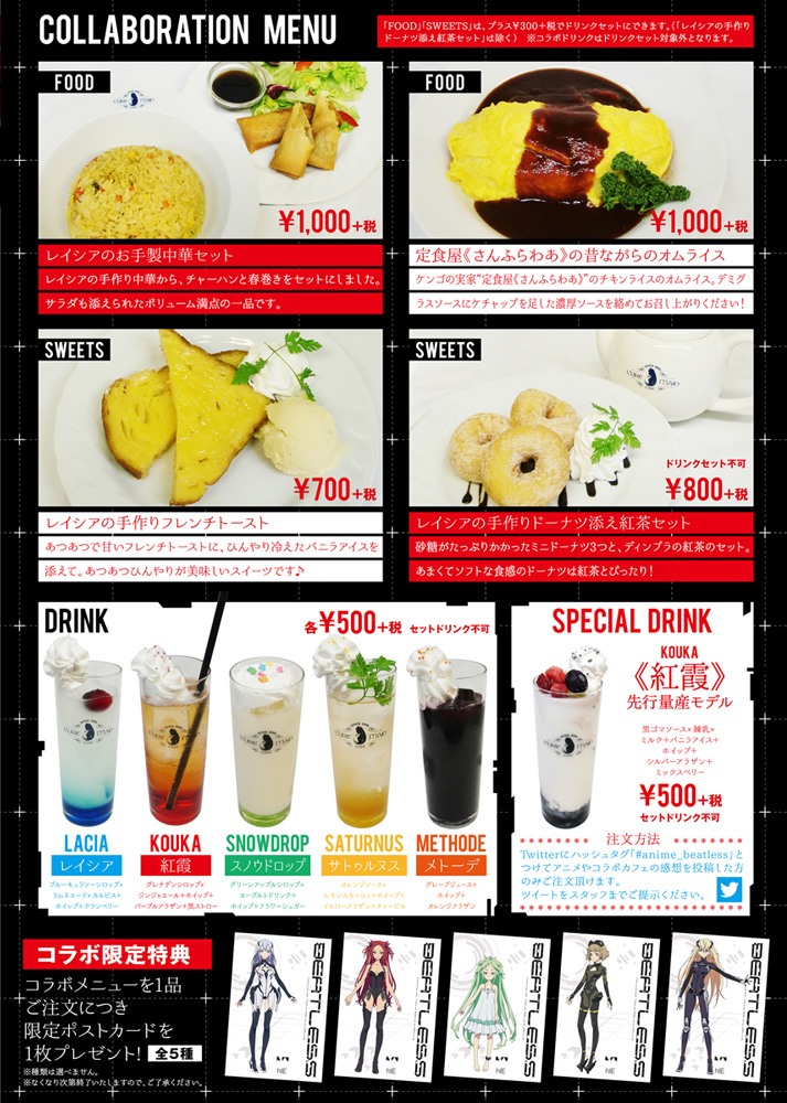 Twitterにハッシュタグ「#anime_beatless」とつけてアニメやコラボカフェの感想を投稿した方のみご注文頂けます。ツイートをスタッフまでご提示ください。