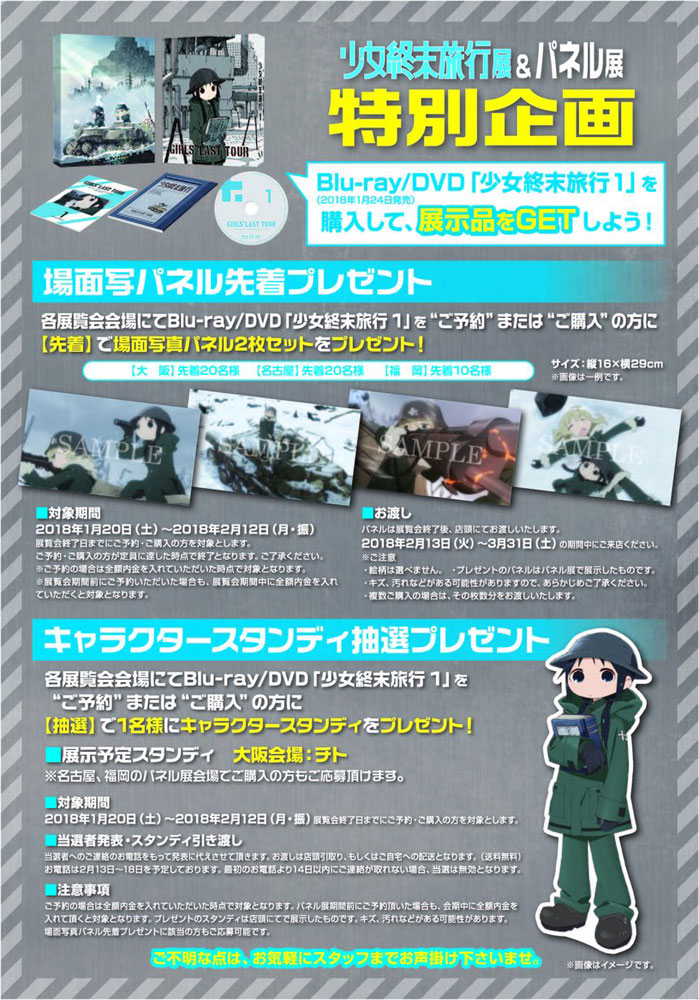 各展覧会会場にて Blu-ray/DVD「少女終末旅行 1」(2018年1月24日発売)をご予約またはご購入の方に【先着】で場面写真パネルを2枚セットでプレゼント!