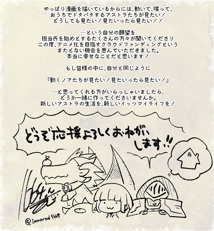 アストラがマイホームを購入する、即ち本編制作が決定するためには、皆様のご協力が不可欠です。全力のご支援、何卒お願い致します!