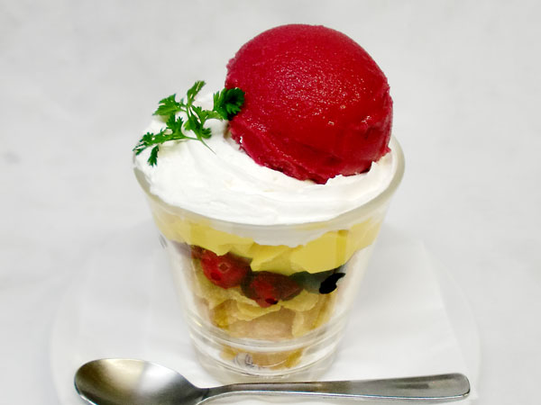 赤いカシスアイスをトッピングし、コーンフレーク、ミックスベリー、