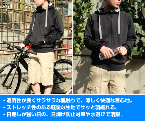 ・吸水速乾性と紫外線カットのW効果を備えた実用性の高いパーカーです。