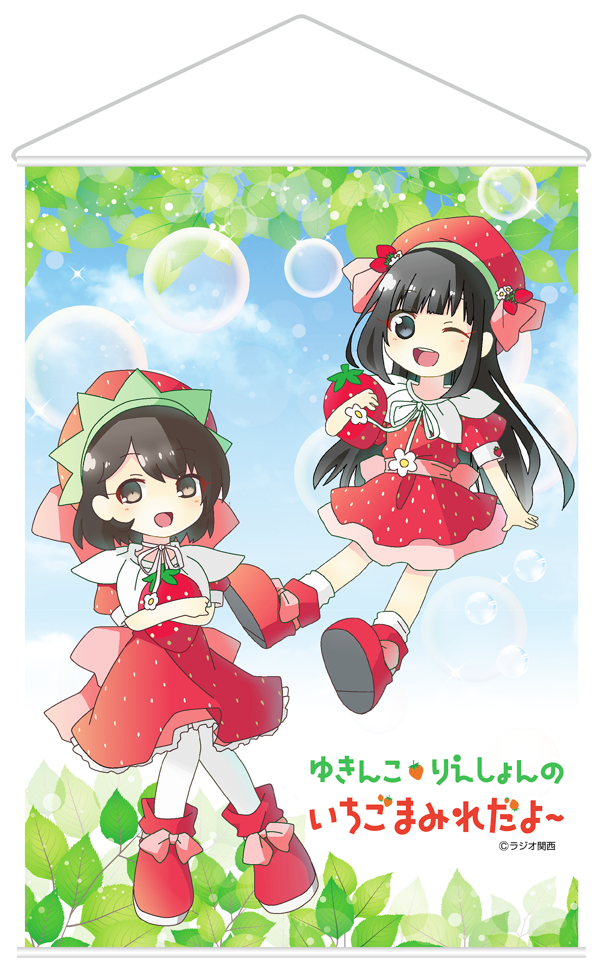 いちごの衣装を着たパーソナリティ2人のイラストが入ったタペストリー。