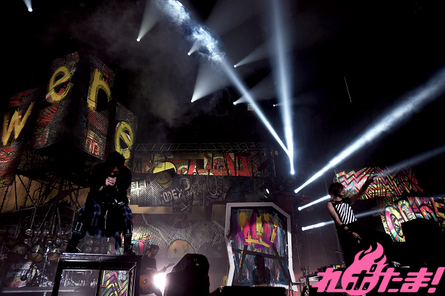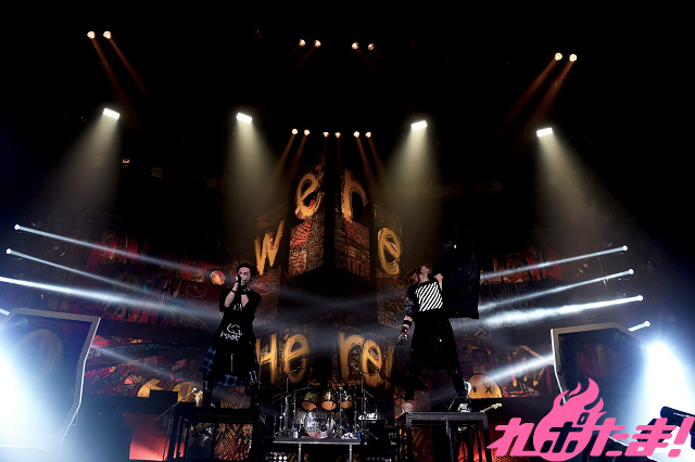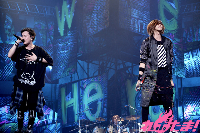「Seek your turn」、「Harsh Wind」などお馴染みのナンバーではポジティブな熱気が会場に溢れ出し、Ta_2の「飛び跳ねな、騒ぎまくれ」という煽りで始まった「#4」では会場が一斉にジャンプ。続く「Frame in Flame」では左右のキャンバスに翼が描かれた。