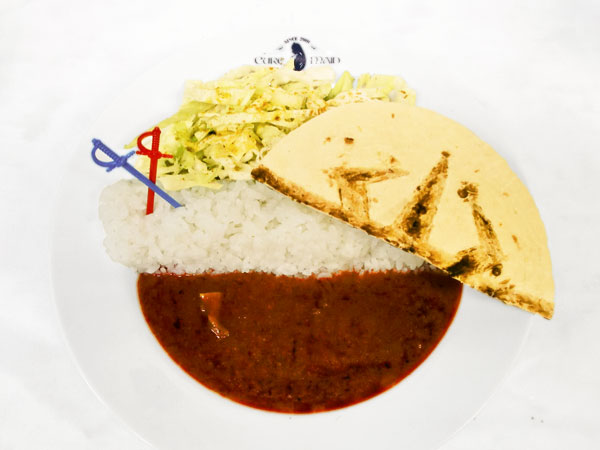 赤色のマサラカレーでアインズギルドの旗を、トルティーヤはアインズのマントをイメージした辛口カレー。