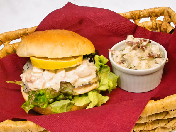 朱の瞳族のクルシュをイメージした白と赤のコールスローサラダを添え、蜥蜴人の団結力を表現しました。