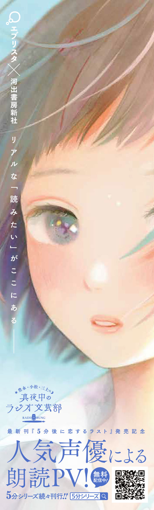 河出書房新社発行のエブリスタ短篇小説集「5分シリーズ」は、累計発行部数26万部を突破した大ヒットシリーズです。そしてこのたび、同シリーズと、出演者・スタッフ・リスナー全員で作家デビューを目指す文化放送の番組『エブリスタ・マンガボックス presents 豊永・小松・三上の真夜中のラジオ文芸部』のタイアップ企画として「朗読プロジェクト」をスタートしました。