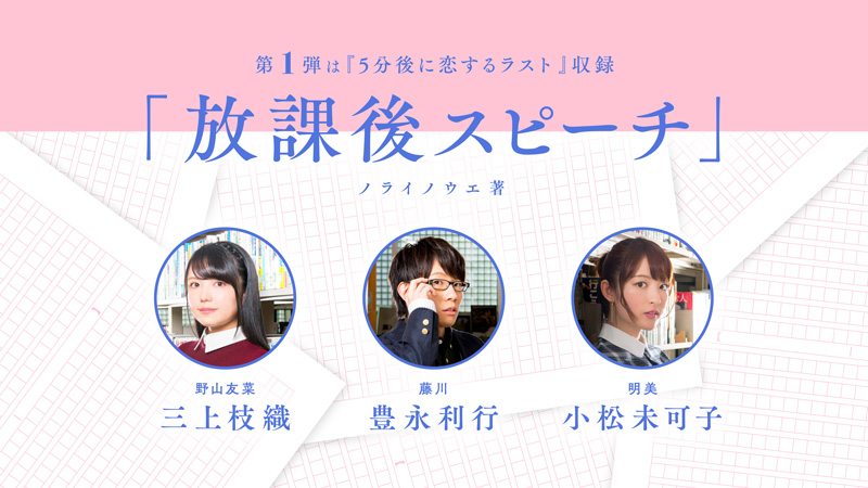 このプロジェクトでは、同番組パーソナリティの人気声優 豊永利行・小松未可子・三上枝織が、「5分シリーズ」の最新刊『5分後に恋するラスト』に収録されている「放課後スピーチ」を朗読し、その朗読PVを3月15日(木)よりYouTube上で無料配信します。さらに、全国の書店2,000軒以上の店舗にて番組ポスターやコラボPOPが貼られたり、店頭では番組オリジナルしおりが無料配布されるなど、本日から期間限定のスペシャルフェアも開催。また、3月14日(水)に発売された「5分シリーズ」の最新2タイトル『5分後に恋するラスト』と『5分後に笑えるどんでん返し』は、パーソナリティ3人の写真が載った『ラジオ文芸部』の帯付きで書店に並びます。