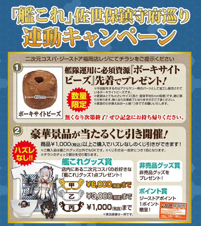 「『艦これ』佐世保鎮守府巡り」で公式物販・展示などが行われるくっけん広場に、二次元コスパ ジーストア福岡店で使用出来るクーポン付きフライヤーを設置。フライヤーを二次元コスパ ジーストア福岡店に持ってくると、「ボーキサイト ビーズ」のプレゼントや艦これグッズが当たるくじ引きが出来ます!