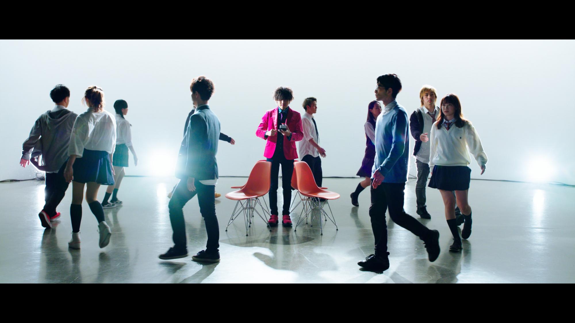 1stシングル「ナウオアネバー」では全編逆再生かつ1カットのMVを制作し、誰も見たことがない映像で話題となった佐伯ユウスケ。MVへの想いについて問われると「楽曲はもちろん、MV単体としても作品の一つとして楽しんでほしいという気持ちが強いんです」とコメント。「皆さんを驚かせられるようなギミックを大切にしていて、インパクトのある映像を目指しています」とこだわりを語った。新曲「ダンシング」では、これまでのMVを手がけた上野コオイチ監督とタッグを組み、新たな映像制作にチャレンジ。『弱虫ペダル』と楽曲の疾走感を追求した結果、「楽曲に合わせてイス取りゲームをする」という破天荒なアイデアが飛び出した。