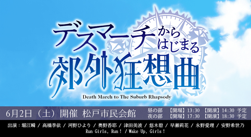 6月2日(土)に開催予定のTVアニメ「デスマーチからはじまる異世界狂想曲」のスペシャルイベント「デスマーチからはじまる郊外狂想曲」に声優ユニットWake Up, Girls!とRun Girls, Run!の追加出演が決定しました。またアニメBlu-ray3巻のジャケットイラストも公開になりました。