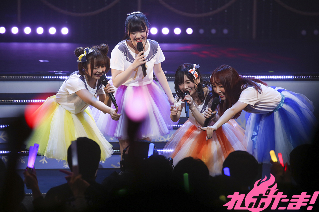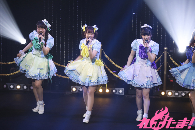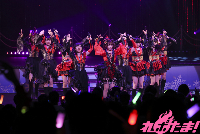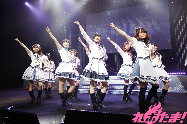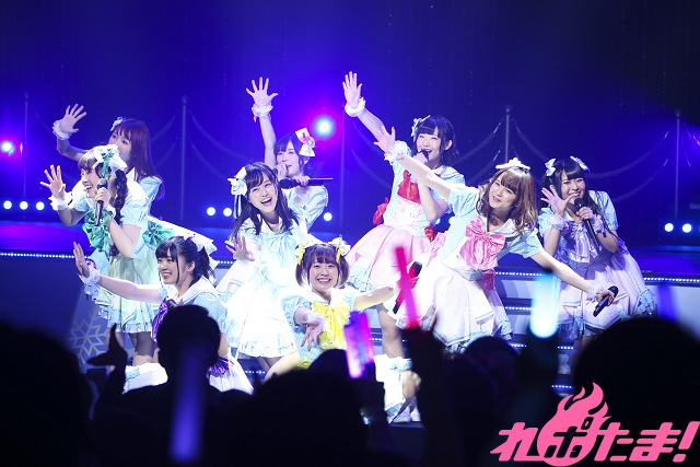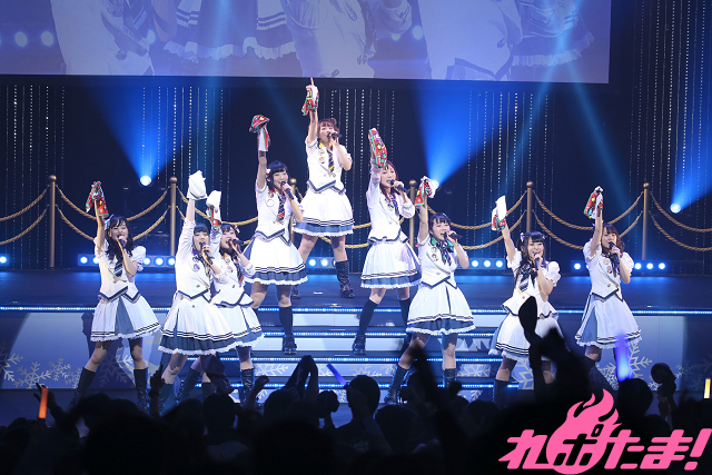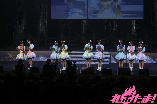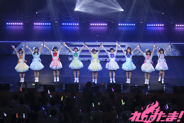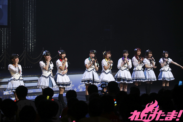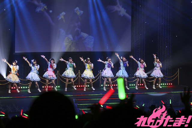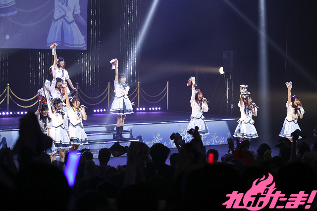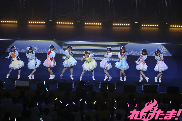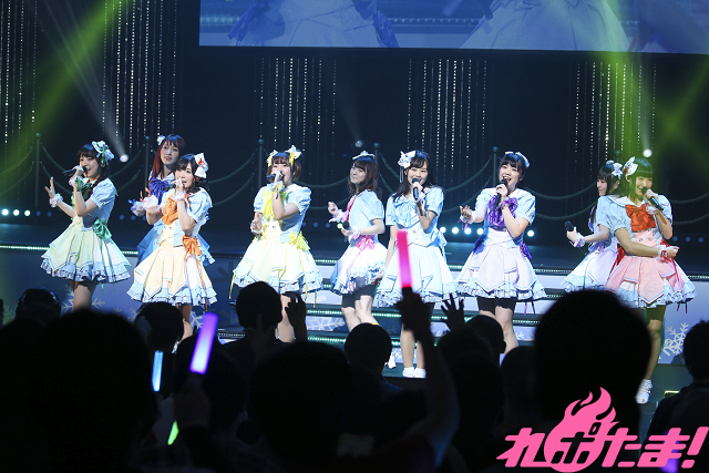 水色と白の衣装にチェンジし「70億分の9の奇跡」、そしてファーストシングルのカップリング「おんくり」を可愛く歌唱。「おんくり」では篠田がクリスマスカラーを見たいとの想いにファンが応え緑と赤に会場が染まり感動的な光景だった。