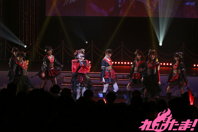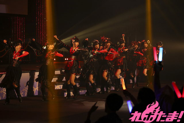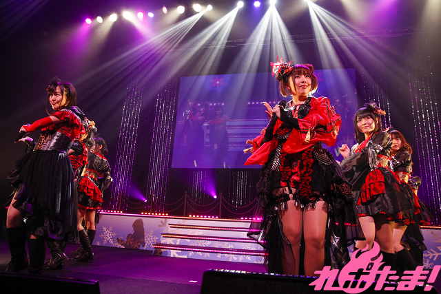 客電が落ち、Vのフォーメーションに正座した9人が揃い、1曲目は「純情-SAKURA-」。セカンドミニアルバム『追憶カレイドスコープ』の冒頭を飾る和メタルチューンで会場を沸かせる。衣装も「純情-SAKURA-」に準じた赤と黒の着物ドレスでキマっていた。