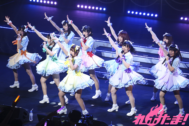 アンコールではセーラー風Tシャツで登場した9人。「粉雪フレンズ」、そして2度目の「70億分の9の奇跡」で元気に楽しくセットリストを締めくくる。そして9人から挨拶。それぞれ今日の日へ掛ける想いが語られた。桑原、和多田、遠藤、本宮などは、昼公演から泣きたくないと言っていたものの溢れる思いが上回っていたのか、涙ぐみながらことばを紡いでいたのが胸を打つ。そんな中からここでは、リーダーの高田の言葉を紹介する。