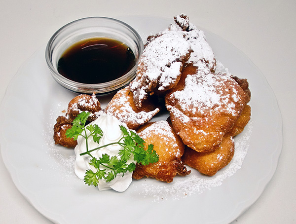 ほんのりあま?い生地をぽたんぽたんと揚げて、粉砂糖をたっぷりかけました。お好みでラムレーズン風ソースをかけてお召しあがりください。