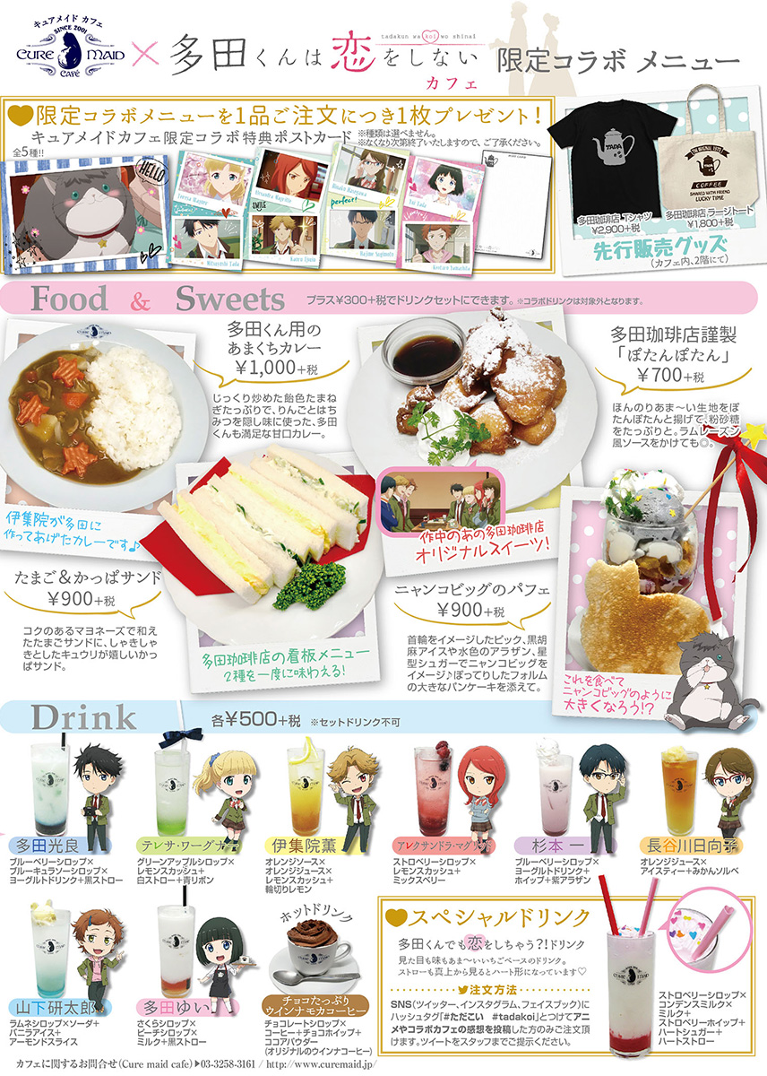 多田珈琲店へようこそ!多田くんも恋をしちゃう(?!)TVアニメ『多田くんは恋をしない』のコラボカフェがキュアメイドカフェで開催決定! 今回のカフェではコラボメニューをなんと全14種類もご用意しちゃいました。
