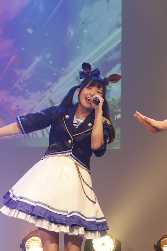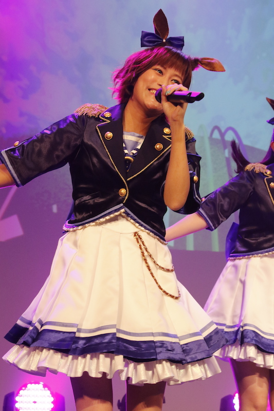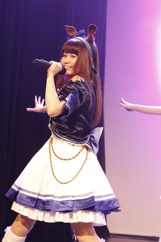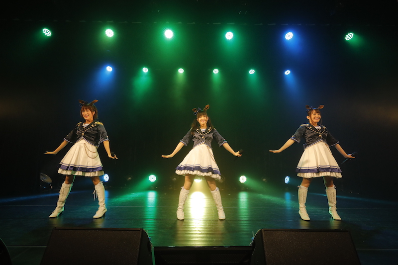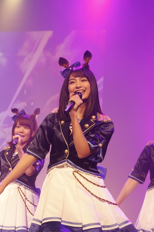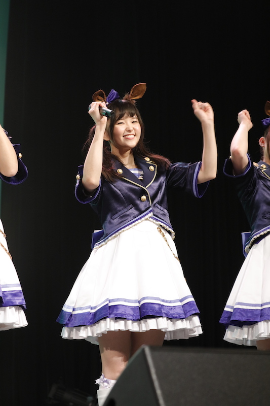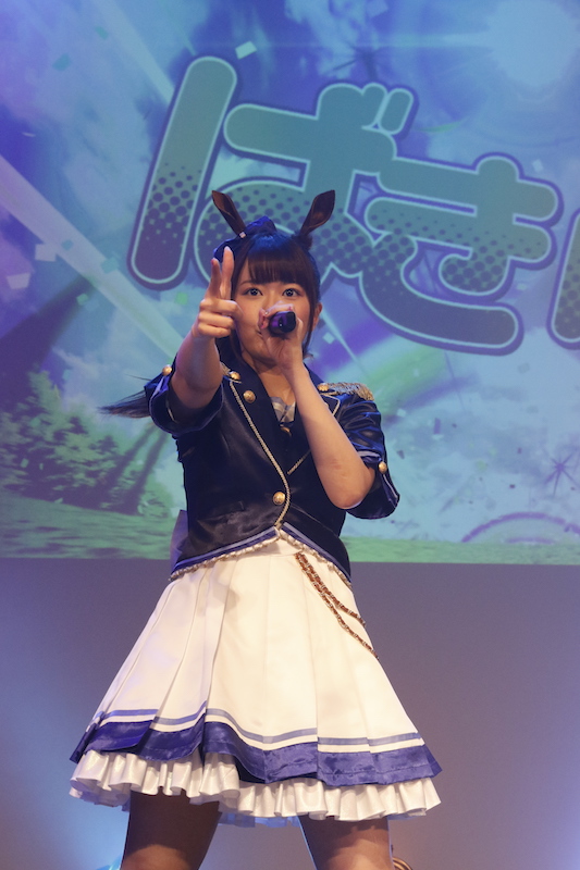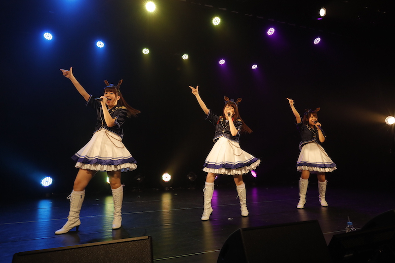 先陣を切るのは三澤。「盛り上がっていきましょー!」という元気な掛け声とともに、「猪突猛進爆進中!!」を熱唱した。続けて登場した田中が「一撃入魂☆ペガサスパンチ」でヒーロー全開のペガサスパンチを繰り出すと、会場のファンがそれに応えてアクションする一面も。「全速!前進!ウマドルパワー☆」では、アイドルを夢見る女の子のキュートさを、大和田が全身で表現した。