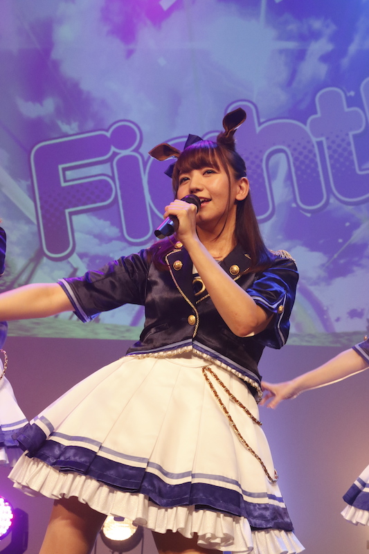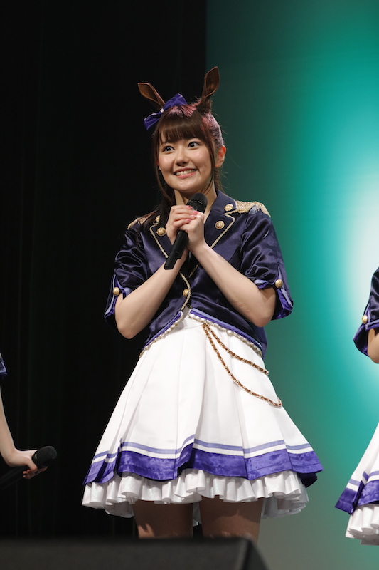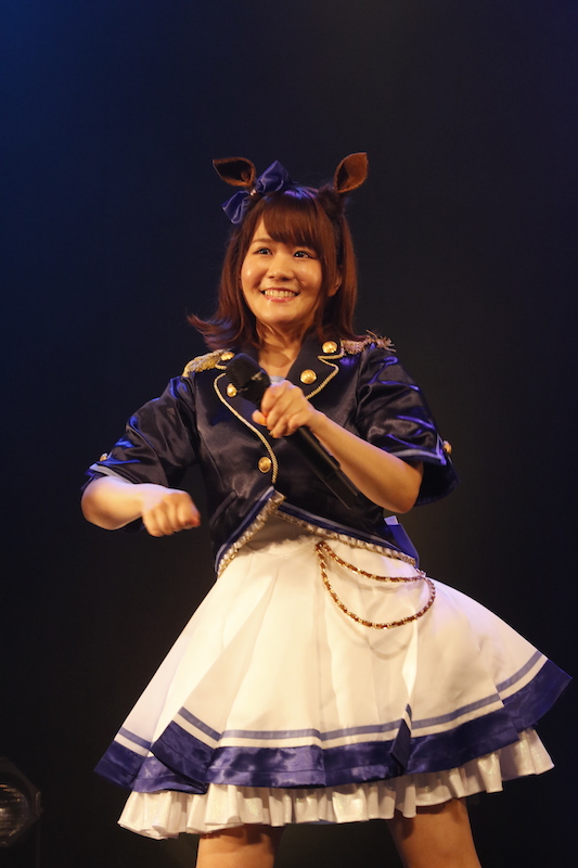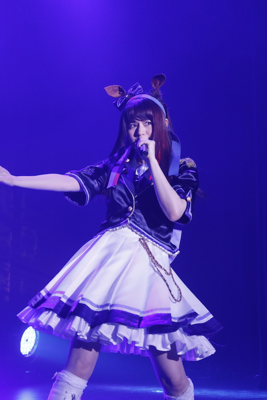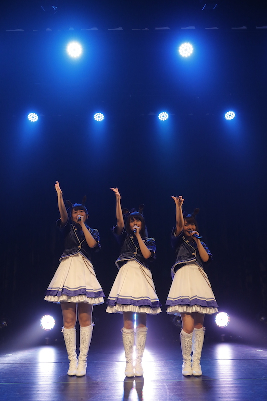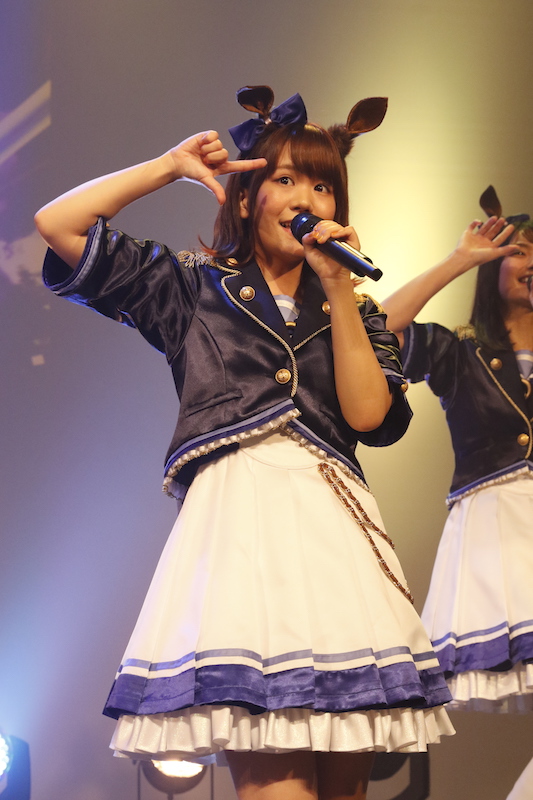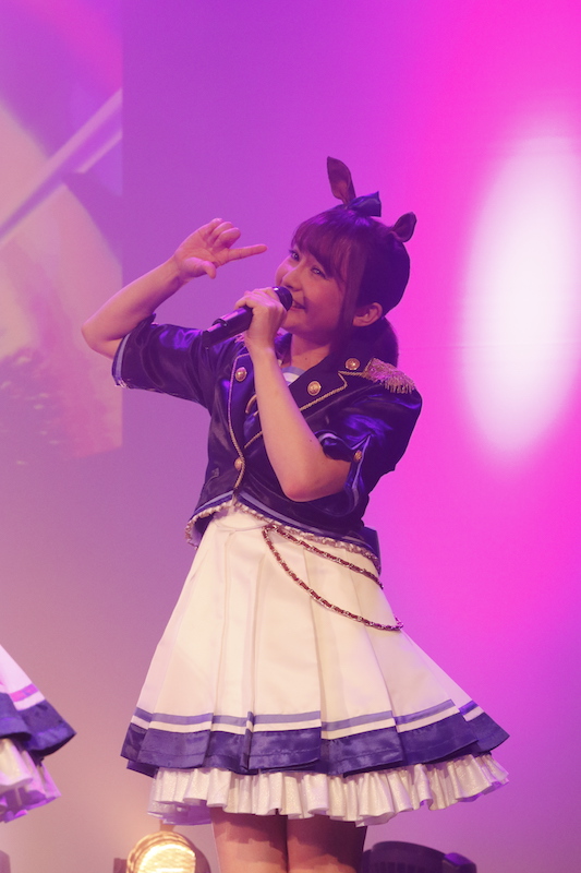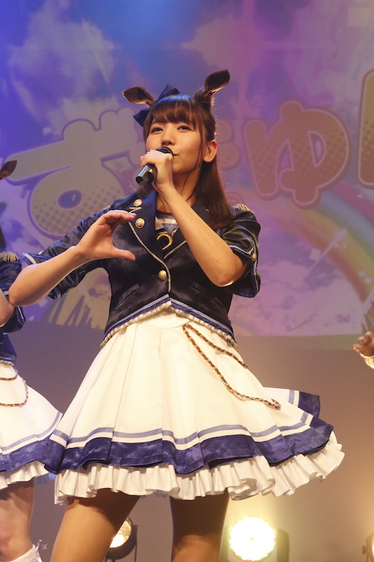先陣を切るのは三澤。「盛り上がっていきましょー!」という元気な掛け声とともに、「猪突猛進爆進中!!」を熱唱した。続けて登場した田中が「一撃入魂☆ペガサスパンチ」でヒーロー全開のペガサスパンチを繰り出すと、会場のファンがそれに応えてアクションする一面も。「全速!前進!ウマドルパワー☆」では、アイドルを夢見る女の子のキュートさを、大和田が全身で表現した。