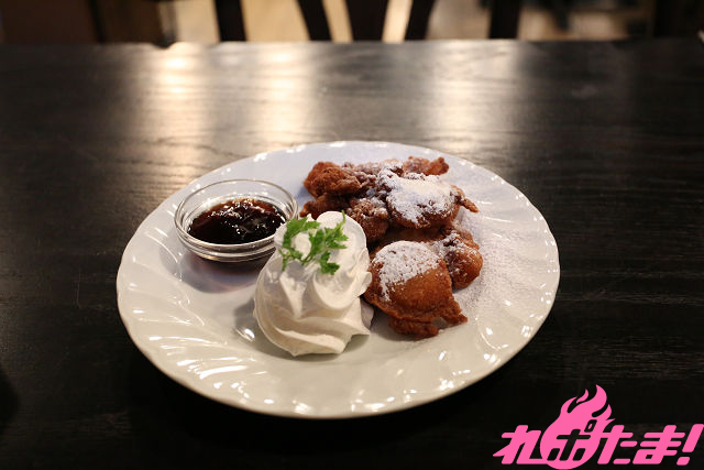 ほんのりあま~い生地をぽたんぽたんと揚げて、粉砂糖をたっぷりかけました。お好みでラムレーズン風ソースをかけてお召しあがりください。