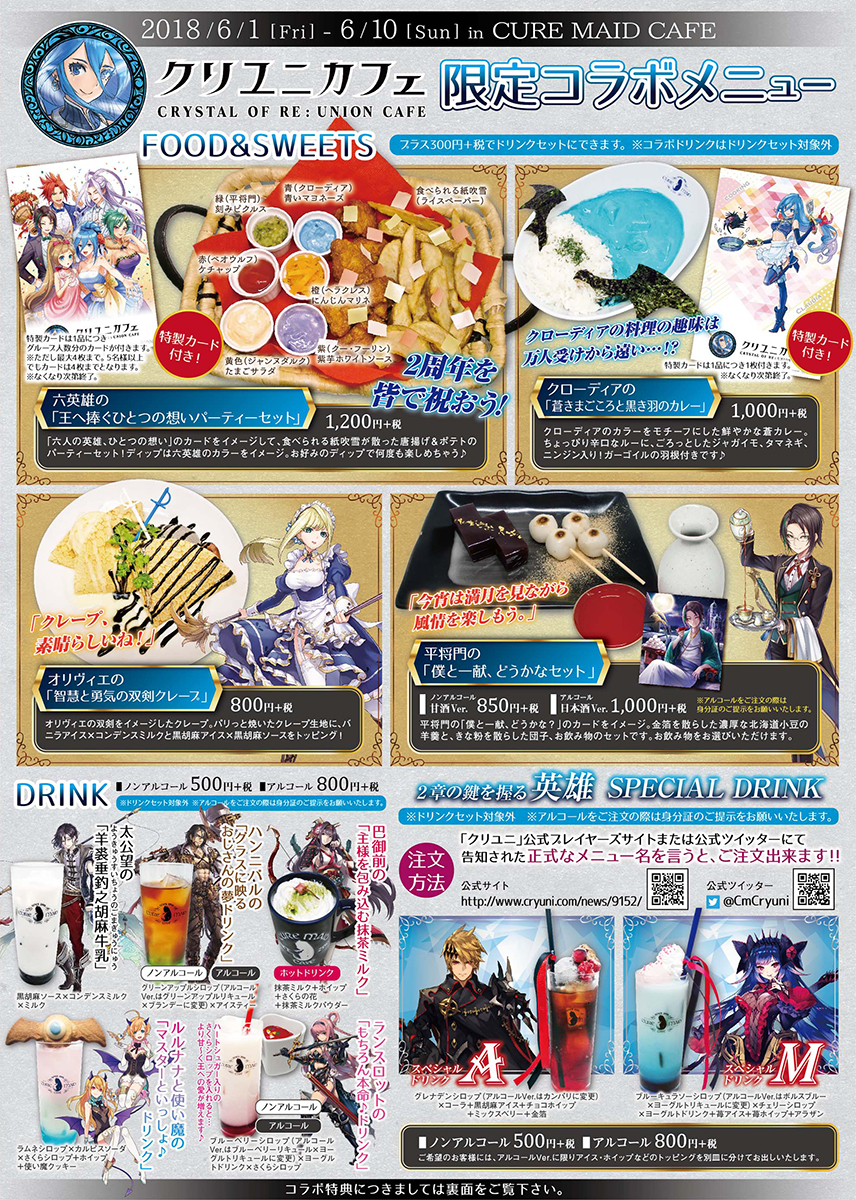 祝2周年! gumiのスマートフォン向けアプリ、超建国ストラテジックファンタジーゲーム「クリユニ」こと『クリスタル オブ リユニオン』の2周年を記念して、キュアメイドカフェにてコラボカフェ、その名も「クリユニカフェ」が開催決定!