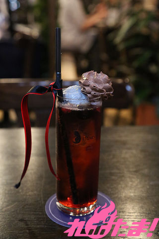 グレナデンシロップ×コーラ+黒胡麻アイス+チョコホイップ+ミックスベリー+金箔+黒ストロー+2色リボン