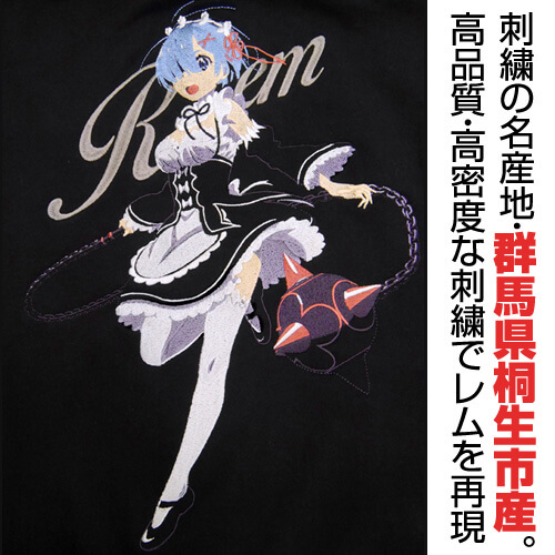奈良時代から絹織物の産地として知られ、日本を代表する機業都市として伝統的な刺繍の名産地でもある群馬県桐生市産の高品質・高密度な刺繍により可愛く凛々しい“レム”の姿を再現。いつもすぐそばに“レム”を感じられるアイテムだ!