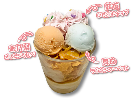 ※結衣=いちごホイップ / 御乃梨=オレンジソルベ / 真白=ラムネシャーベット