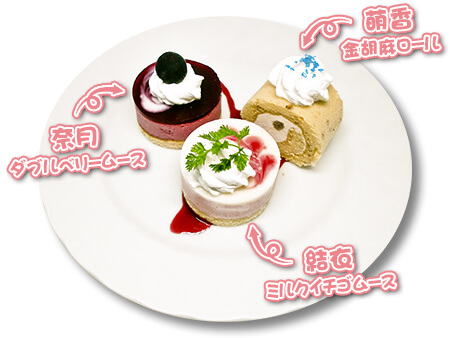 ※結衣=ミルクイチゴムース / 奈月=ダブルベリームース / 萌香=金胡麻ロール