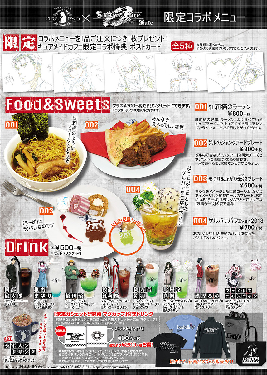コラボメニューが充実! ラボメンたちをイメージしたドリンクやフード・スイーツなど『シュタインズ・ゲート ゼロ』の世界観を味わえちゃいます! さらに、これらオリジナルメニューをご注文頂く毎に、キュアメイドカフェコラボ限定特典【限定ポストカード(全5種)】から1枚プレゼント!