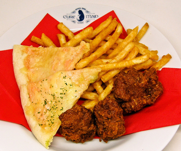 ダルの好きなジャンクフード(明太チーズピザ、ポテトと唐揚げ)の盛り合わせ。