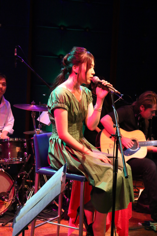 そしてピアノの旋律に導かれて、ミニアルバムの収録曲「イエスかノーか半分か」でライブが開幕。ギター、バイオリン、コーラス、ウッドベース、ドラムのアコースティック編成に乗せて、大原の澄んだ歌声が店内を包み込んでいく。2曲目は前菜(オードブル)の「星に雲に揺れる木々に」。切なくも優しい楽曲を歌い終えると、客席から温かい拍手が送られた。