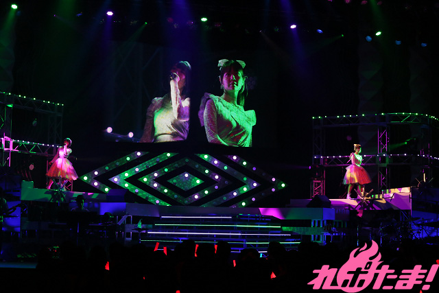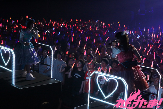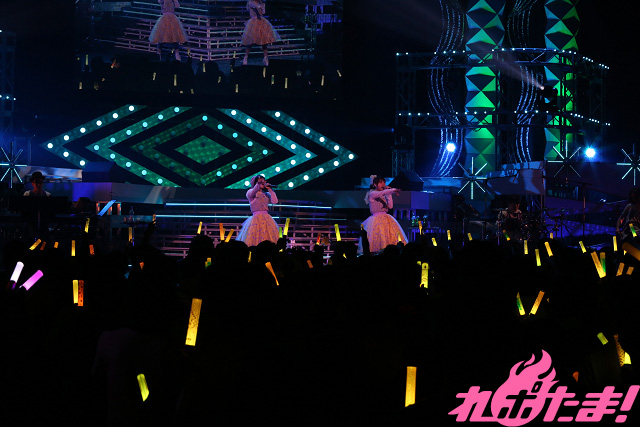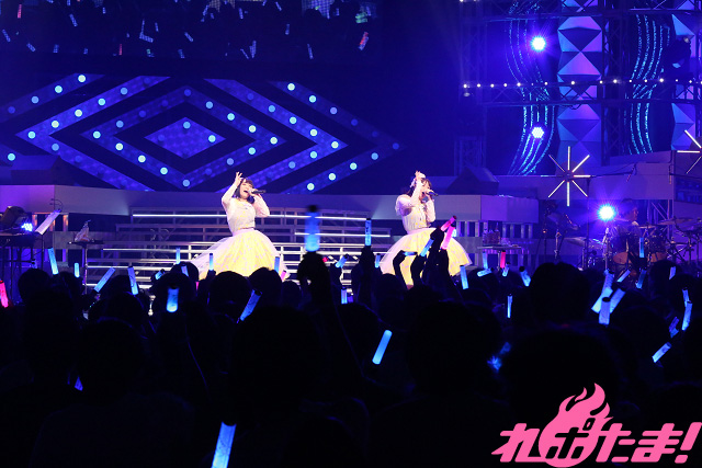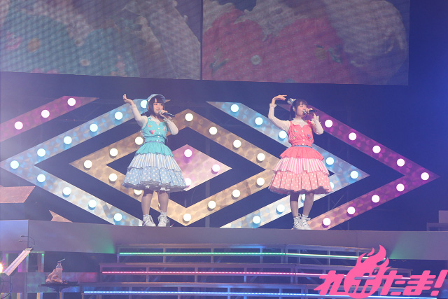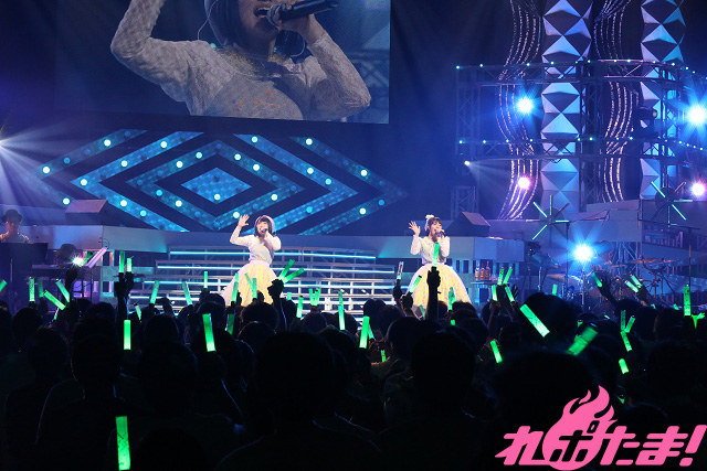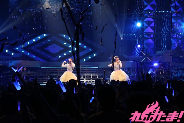 後半はライブパート。リアジュボーンの演奏に乗せて「鏡のデュアル・イズム」、ふたりの掛け合いが楽しい「スキ キライ キライ 大スキ♡」、そして新曲のTVアニメタイアップ曲、アニメ『百錬の覇王と聖約の戦乙女』エンディングテーマ「世界中が恋をする夜」、『七星のスバル』オープニングテーマ「360°星のオーケストラ」を連続で投下。ふたりいわく「デスゾーン」を突破し、ここからは「無法地帯ゾーン」。タオル曲の「#彼氏いません」、キュートな振り付けにも注目の「Eat or Love??」、そして1時間近く前に振り付け講座が行なわれた「キラリキラリ」と続いていった。