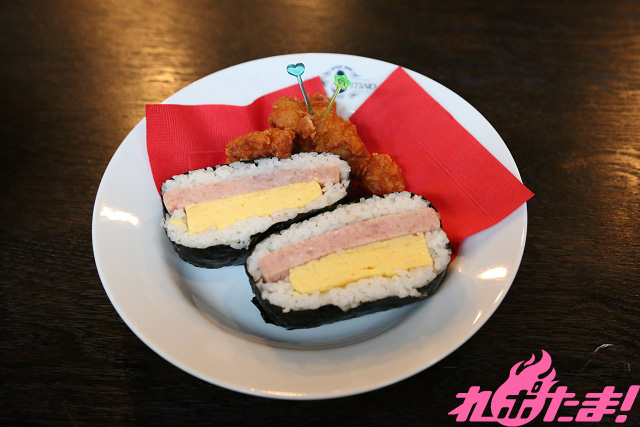 かなたのおばあちゃんも作っていた沖縄のおにぎり。具には沖縄名物のスパムと甘口の卵!から揚げも添えたプレート。スパムのしょっぱさと卵の甘さが絶妙!