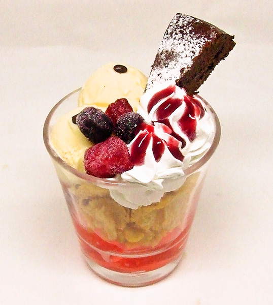 ストロベリーゼリーやフランボワーズソース、ミックスベリーなどを使った赤いパフェ。