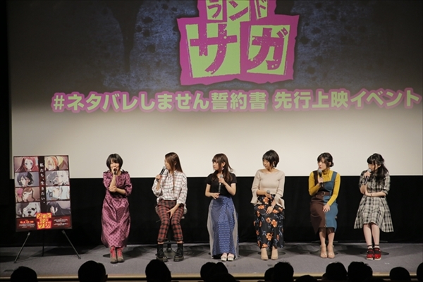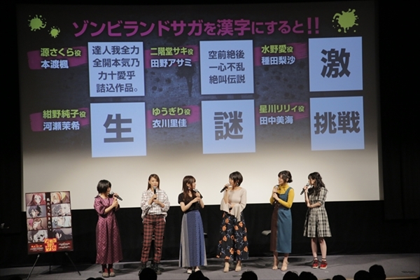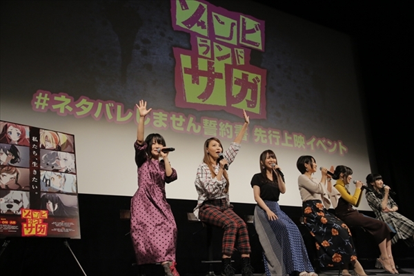 9月22日にオリジナルTVアニメ「ゾンビランドサガ」の第1話、第2話の先行上映会がスペースFS汐留(東新橋1丁目1−16)にて実施され、本渡楓、田野アサミ、種田梨沙ら6名のキャストが登壇、来場したファンに初公開となるアニメ本編映像をお披露目しました。