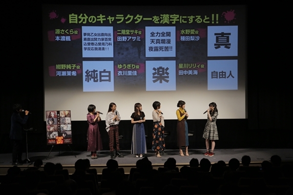 さらに、「自ら演じるキャラクター」を漢字のみで表すという企画では、「源さくら」を「夢見乙女出直向出素直出努力家否突込受巻込受周乃科学反応我湧湧!!」と表現した本渡にほかの出演者から「どうしたどうした!?」という心配の声が上がりました。本渡は、この漢字の意味を「夢見る乙女で、ひたむきで、素直で、努力家、否、ツッコミを受け、巻き込みを受け、周りの化学反応がわくわく」と解説。「当て字じゃん!」「ずるいわ!」とツッコミを受け、会場を笑いの渦に包みました。また、田野は作品を漢字で「空前絶後一心不乱絶叫伝説」と表し、「ありえない伝説をこの作品で作って欲しいという意味を込めました。そして私は一心不乱で頑張って今までにない作品を作り上げたいと思っています。」と熱い思いを打ち明けました。