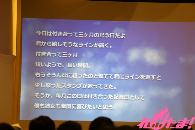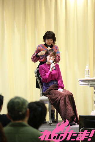 「出張版 るるきゃんの小部屋」コーナーでは「あなたの理想のデートシチュエーション」をいくつか挙げ、その中でひとつのお題をエチュードで披露。「動物ふれあいデート」では「動物と戯れる男の人にときめいちゃう」とふたりが口をそろえていた。今回エチュードしたのは「ジムデート」。佳村さんが、男性と女性、いわゆる「どっちもイケるくち」のキャラクターと化し、会場は爆笑の海に。