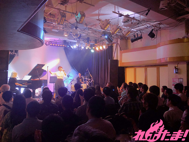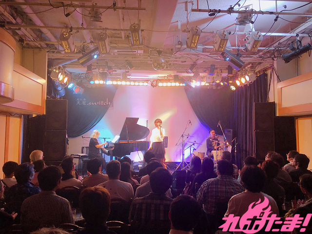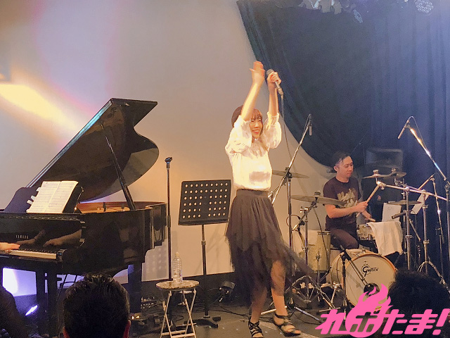 今までのアコースティックライブは楽器ひとつの編成だったが、今回は「前回のライブ後、ファンと一緒に飲んでいた(笑)」というピアノの「きくちゃん」と、今回初めてセッションするドラムの「はぎさん」と3人で展開。厚みのあるステージとなった。